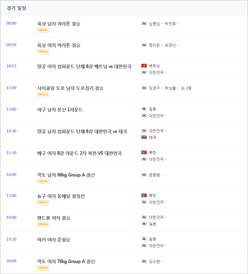 | 10:55 | 양궁 | 여자 단체 컴파운드 8강 베트남 VS 대한민국 |
