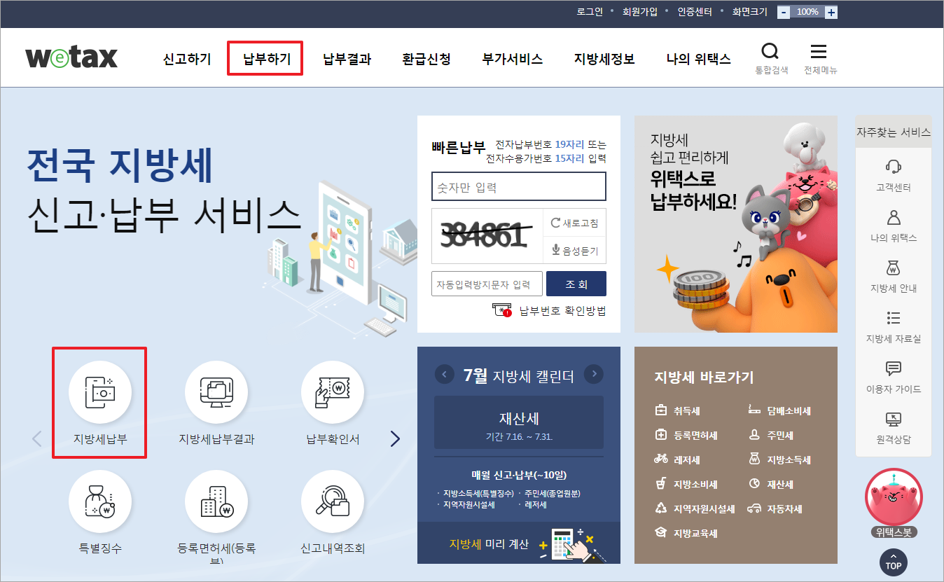 재산세는 지방세에 속합니다. 재산세 조회 및 납부는 위택스에서 진행하면 됩니다.