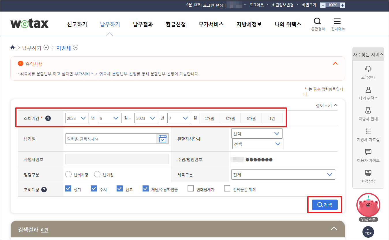 ③ 조회기간, 납기일, 관할자치단체 등 필요한 내용을 입력한 후 검색을 클릭. 검색결과의 보유 재산을 확인합니다.