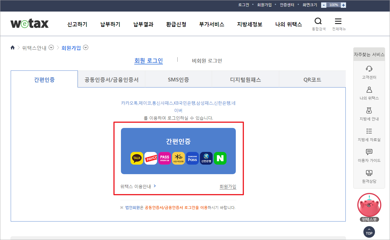 ② 로그인을 합니다. (간편 인증, 공동/금융 인증서, SMS인증)